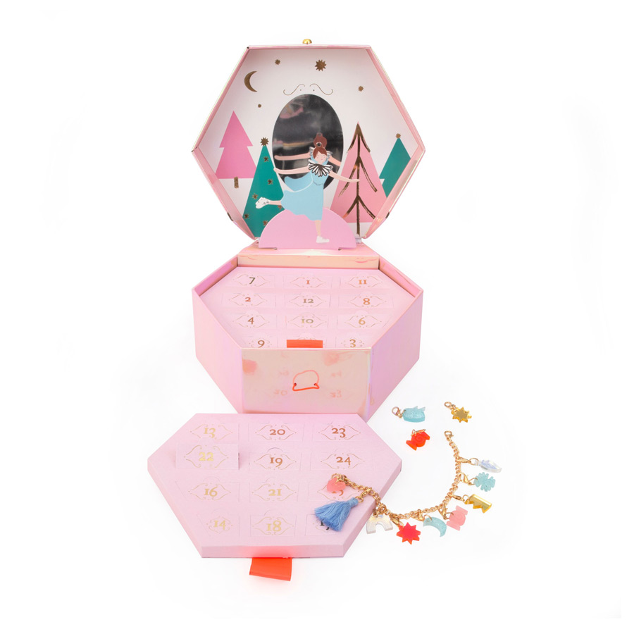 Un magnifique calendrier de l'Avent présenté dans une boîte en forme d'hexagone, de couleur rose iridescent et aux touches dorées ! Une jolie boîte en carton rigide que vous pourrez réutiliser pour y mettre les bijoux de votre princesse ! Facilement transportable grâce à sa poignée orange fluo et son fermoir doré !