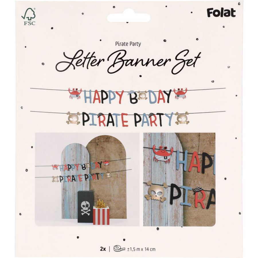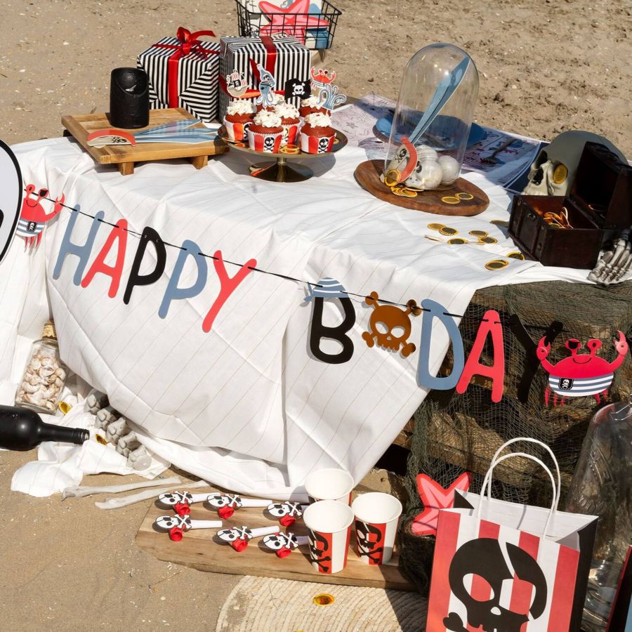 Ajoutez une touche d'aventure à l'anniversaire de votre enfant avec notre Guirlande Lettre Happy Birthday Pirate Party. Composée de deux guirlandes distinctes, elle affiche fièrement les textes "HAPPY BIRTHDAY" et "PIRATE PARTY", chaque lettre mesurant environ 14 cm de haut. Ces guirlandes sont ornées de crânes et de crabes pour un effet pirate des plus authentiques, parfait pour une fête inoubliable.