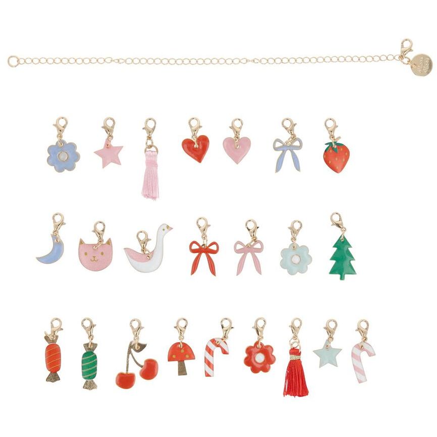 Chaque jour, un nouveau trésor : dès la porte numéro 1, votre enfant découvre un bracelet à chaîne dorée, puis s’émerveille quotidiennement en trouvant des charms en métal, accompagnés de jolis pompons en coton rouge et rose pâle. Ces petits bijoux, cachés derrière des portes numérotées et décorées de rubans de velours vert, permettront de personnaliser le bracelet jour après jour. Une fois Noël passé, cette valise raffinée se transforme en boîte de rangement idéale pour les trésors de vos petits artistes en herbe !