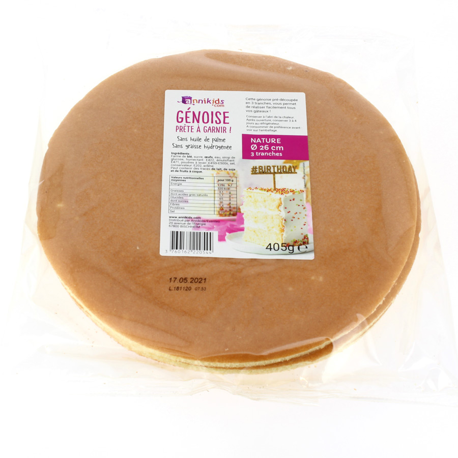 Facilitez-vous la vie avec cette génoise nature de 26 cm de diamètre, déjà découpée en 3 tranches, prête à l'emploi pour réaliser un beau gâteau d'anniversaire en vous consacrant sur le plus sympa : la déco !