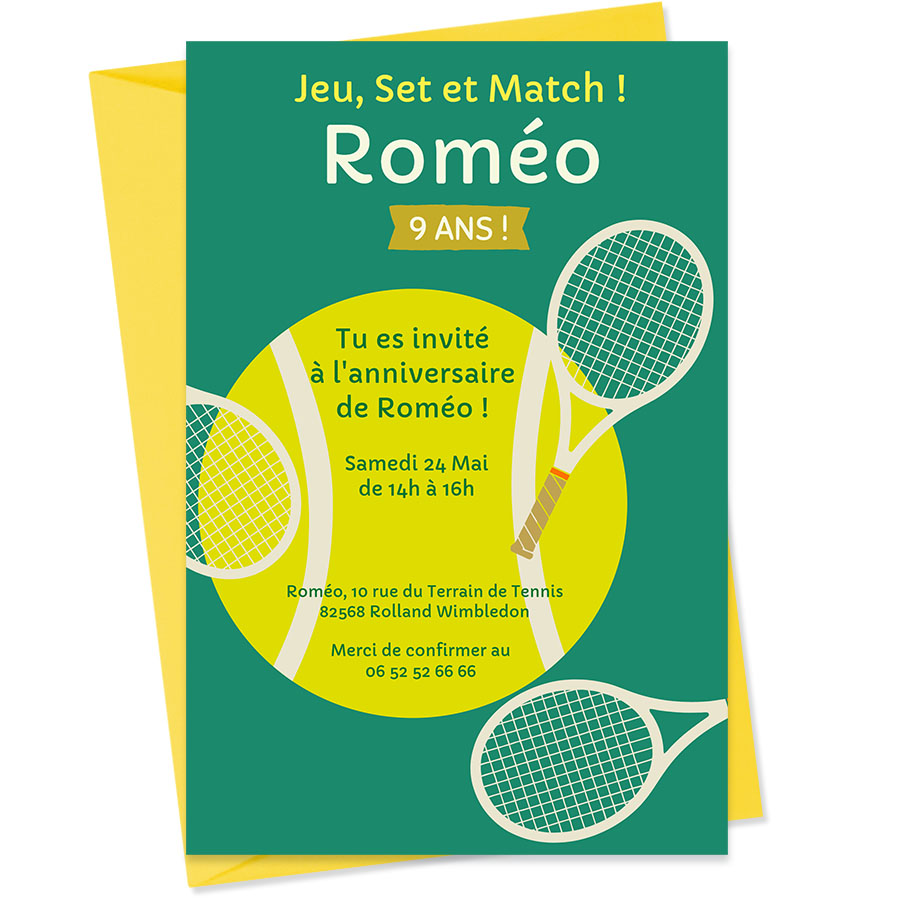 Chaque invitation est accompagnée d'une enveloppe assortie de la marque Clairefontaine, symbole de qualité et de fabrication française. Ne ratez pas cette chance d'ajouter une touche d'élégance et de sportivité à l'anniversaire de votre enfant, en optant pour ce produit qui met à l'honneur le tennis. Faites sourire votre enfant et ses amis avec cette Invitation à personnaliser - Tennis, tout en leur promettant une fête mémorable !