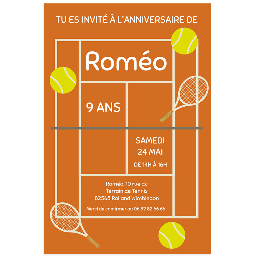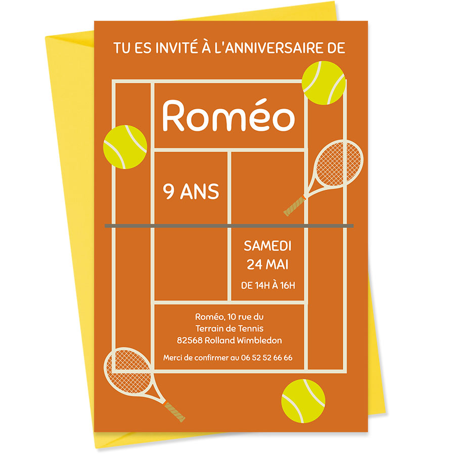 Chaque invitation est accompagnée d'une enveloppe assortie de la marque Clairefontaine, symbole de qualité et de fabrication française. Ne ratez pas cette chance d'ajouter une touche d'élégance et de sportivité à l'anniversaire de votre enfant, en optant pour ce produit qui met à l'honneur le tennis. Faites sourire votre enfant et ses amis avec cette Invitation à personnaliser - Terrain de Tennis, tout en leur promettant une fête mémorable !